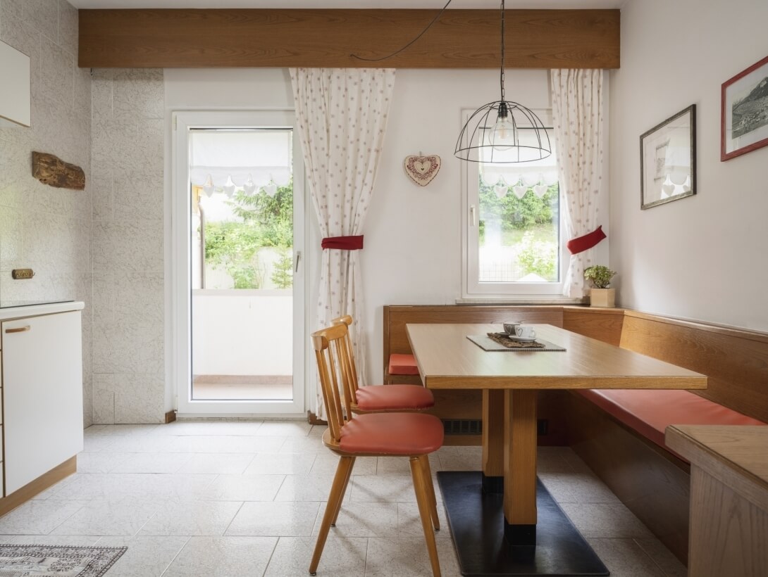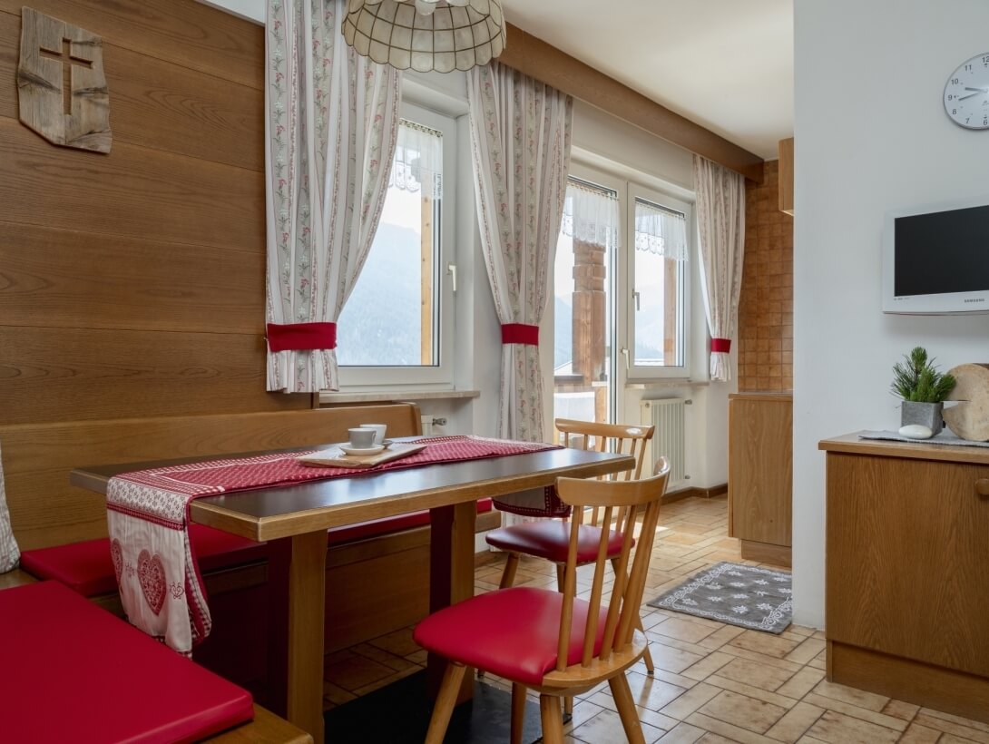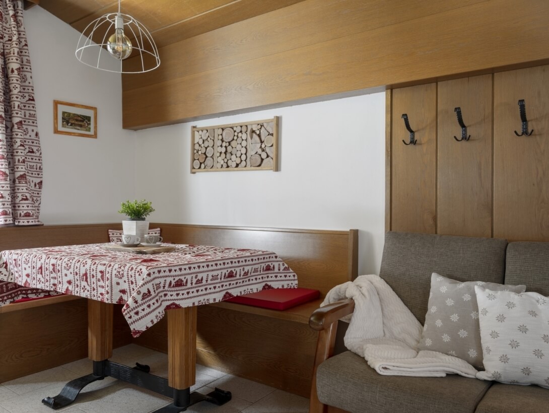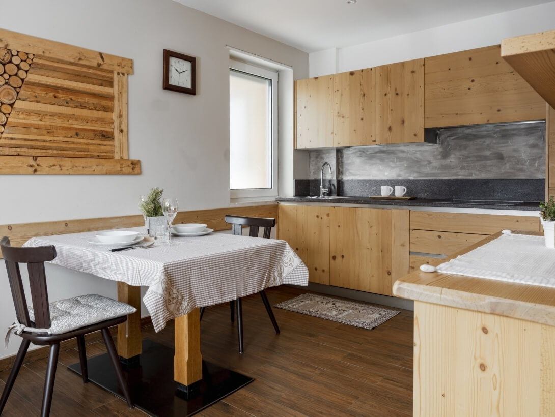 Semplicità e concretezza: ecco ciò che traspare da questo appartamento che, grazie agli arredi in legno, sfoggia la vera essenza ladina.