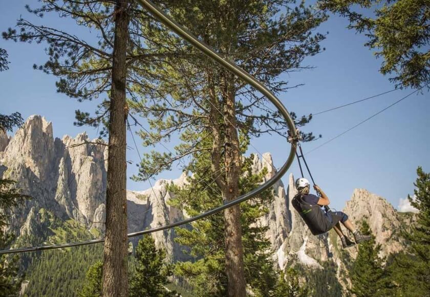 Die Fly Line Catinaccio Rosengarten wurde 2015 gebaut und ist eine Anlage mit einer Länge von etwas mehr als einem Kilometer, die an den Bäumen des Waldes befestigt ist.